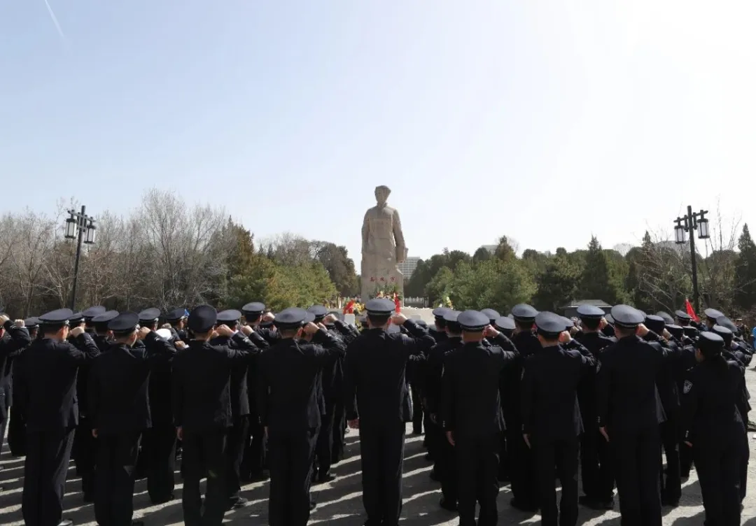 民警代表瞻仰高君宇烈士像并敬献鲜花。随后参观高君宇雕塑广场、主墓区和解放太原革命烈士纪念碑。